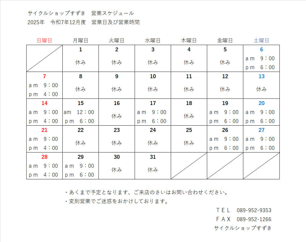 令和7年12月度営業時間のお知らせです2025.11.25 お知らせ